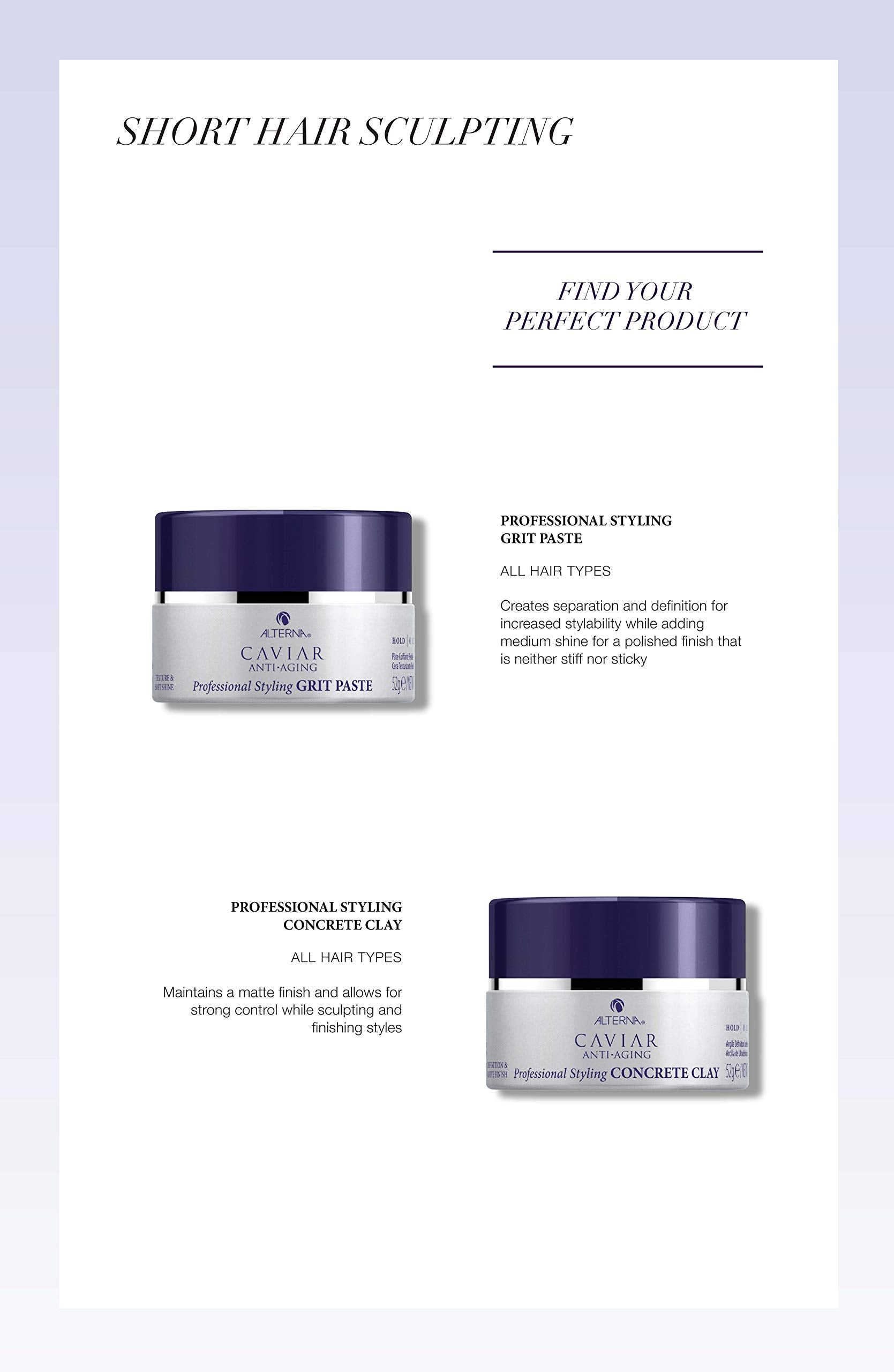 Product Description Alterna Caviar Professional Styling Grit Paste is a medium hold styling paste that creates high definition silhouettes, separating layers while providing soft shine. Hold level 3. Brand Story We create innovative haircare and styling products inspired by skincare science and formulated with pure and effective ingredients, designed to deliver performance without compromise for an exceptionally luxurious experience